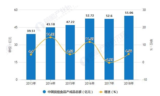 2013-2018年中國烘焙食品產(chǎn)成品總額統(tǒng)計(jì)及增長情況
